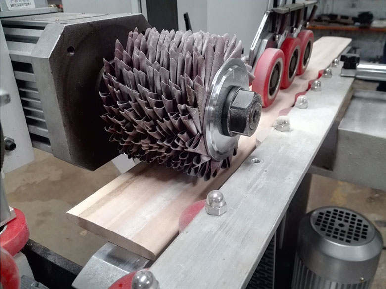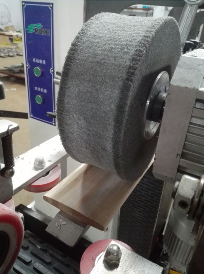 使用TBM材料(氧化铝、碳化硅酮树脂)、聚亚胺脂研磨轮、无纺布轮、砂轮、尼龙轮、纱布条轮等研磨材料修成适合于工件表面的形状,在砂头电机的带动下对工件进行分段式仿形研磨。